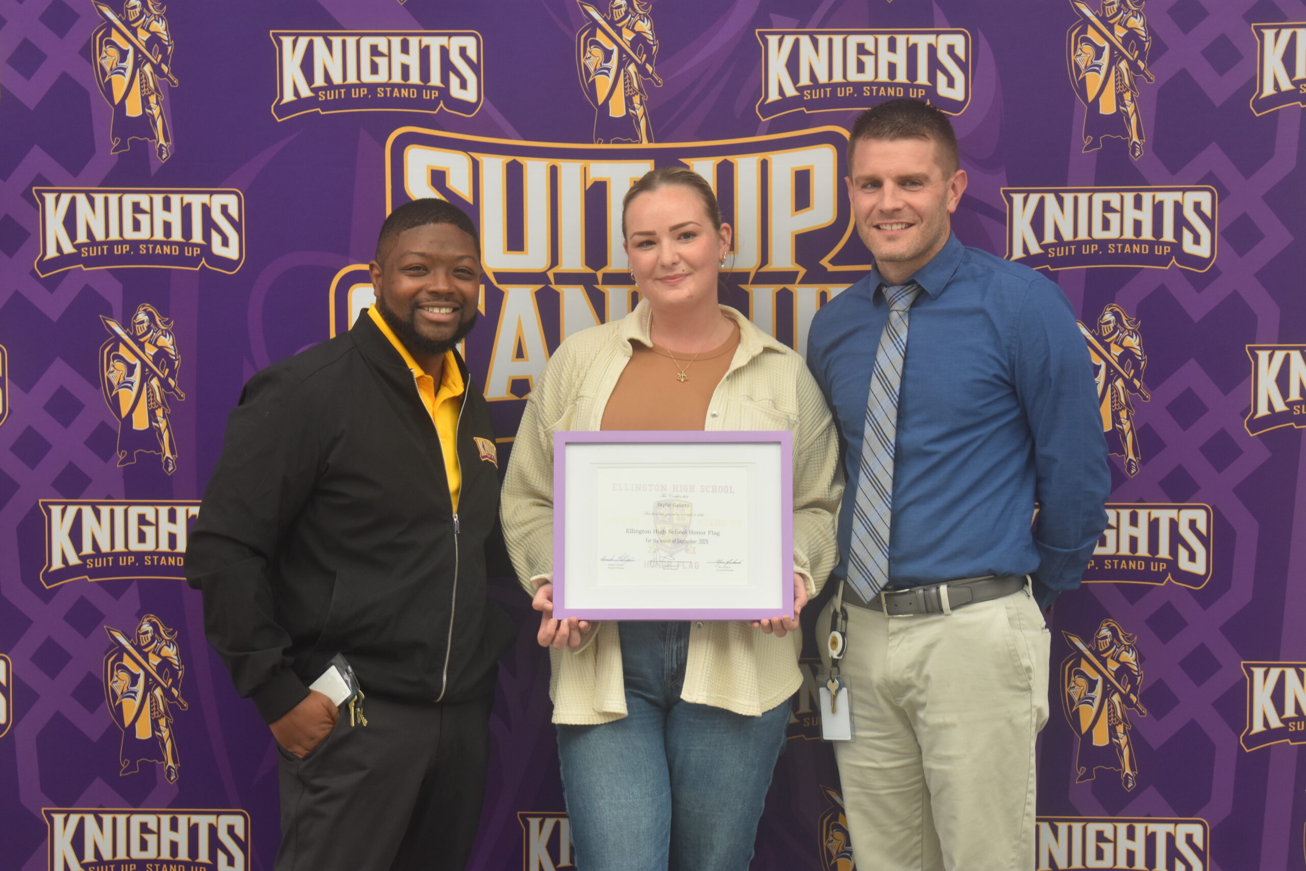 The leadership at Ellington High School wasn’t looking for another trend-based initiative. Instead, they wanted to understand what was currently working for them, what wasn’t and how they could align under their singular identity as Knights. By bringing together staff, students alumni and their Board of Education for a community roundtable, they worked with Jostens school identity expert John Jenson to define their core beliefs. Throughout the process, HuBrins shared, “We didn’t create new values, we just doubled down on the things we already said we believed. We started holding each other accountable to those things and getting on the same page about who we are once we had that in place.” Concluding the community roundtable, “We coalesced around two important ideas: Every successful Knight has to SUIT UP by developing our skills for the challenges ahead and STAND UP by using our skills to face those challenges.”